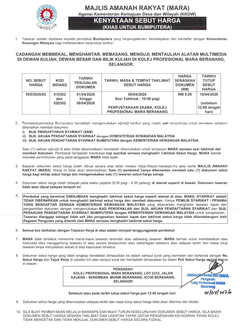 | 6 | KPMB 505/2026/02 | CADANGAN MEMBEKAL, MENGHANTAR, MEMASANG, MENGUJI, MENTAULIAH ALATAN MULTIMEDIA DI DEWAN KULIAH, DEWAN BESAR DAN BILIK KULIAH DI KOLEJ PROFESIONAL MARA (KPM) BERANANG, SELANGOR. | 01/04-08/04/2026 | 16/04/2026 | klik |