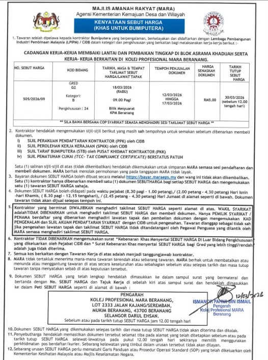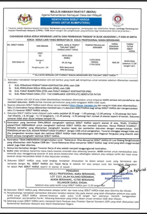 | 5 | KPMB 505/2026/10 | CADANGAN KERJA-KERJA MEMBAIKI LANTAI DAN PENGGANTIAN TINGKAP DI BLOK AKADEMIK I, P DAN M SERTA KERJA- KERJA LAIN YANG BERKAITAN DI KOLEJ PROFESIONAL MARA BERANANG. | 12/03-17/03/2026 | 30/03/2026 | klik |